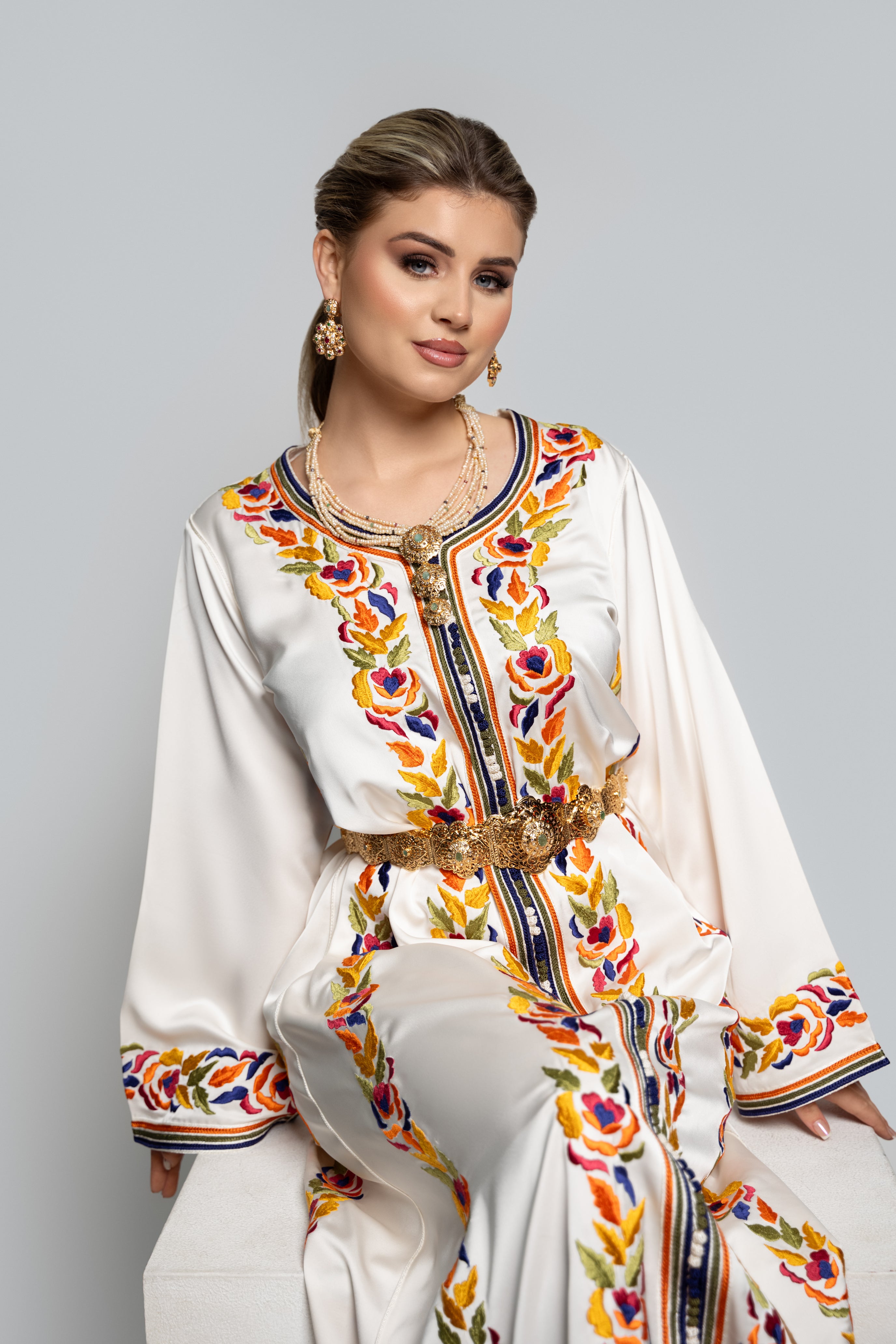 Off-white satijnen ééndelige caftan met gekleurde borduursels, ronde hals. Borduursels ook op de achterzijde van de caftan met strengen